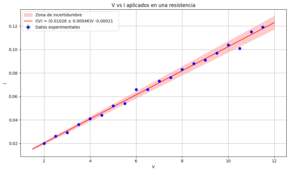 # 6) Gráfica con barras de error y zona de incertidumbre